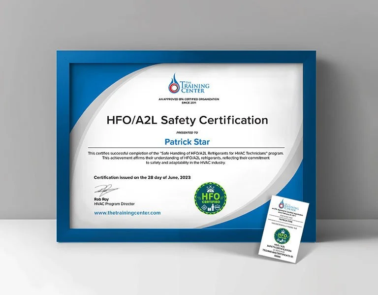 Our A2L Certification course includes carefully curated modules to accelerate your learning journey in understanding and handling HFO, A3, and A2L refrigerants. Our course is on demand and self-paced, with practice tests and a non-proctored final exam (unlimited attempts) with instant results. Score 70 percent to earn The Training Center HFO / A2L certification and a customized ID card. The Training Center has been an EPA-approved training provider since 2011.